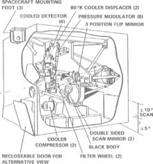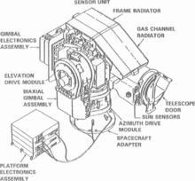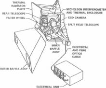 In order to support scanning, the instrument came in two parts, the optics unit on a two-axis gimbal and a fixed electronics unit. The optics unit contains a telescope that collects solar energy as well as the gas detectors. The electronics unit handles data, motor control and power for the instrument.