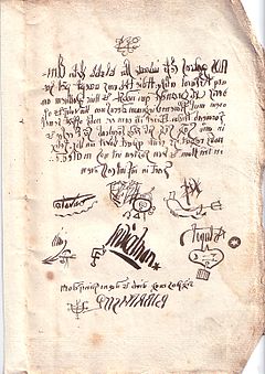 One of the documents introduced as evidence during Grandier's second trial is a diabolical pact written in Latin and apparently signed by Grandier. Another, which looks illegible, is written backwards, in Latin with scribal abbreviation, and has since been published and translated in a number of books on witchcraft. This document also carries many strange symbols, and was "signed" by several demons with their seals, as well as by Satan himself.[citation needed] Deciphered and translated to English, it reads: