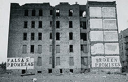 "(In Chicago) while whites were among those uprooted in Hyde Park and on the North and West Sides, urban renewal in this context too often meant, as contemporaries noted, "***** removal". Between 1948 and 1963 alone, some 50,000 families (averaging 3.3 members) and 18,000 individuals were displaced."
