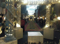 Moreover, every September during the Festival of their local patron saint, San Miguel Arcángel, Uriangatenses lay down homemade colorful religious carpets in their city's streets. They also construct large religious arches, decked with elaborate flower and lighting arrangements. These costly "arcos" fill Uriangato's narrow byways.