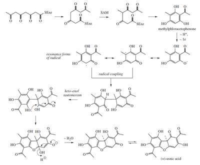 Usnic acid is a polyketide biosynthesized via methylphloroacetophenone as an intermediate.[6]