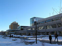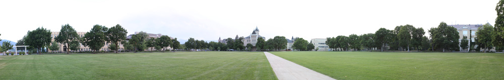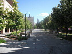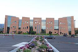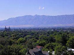 USU's main campus in Logan is situated on about 400 acres (1.6 km2), approximately one mile northeast of downtown Logan, at the mouth of Logan Canyon.[7] The campus lies on a "bench," or shelf-like foothill overlooking the valley to the west. Mount Logan and the Bear River Range rise sharply to the immediate east. The campus contains more than 100 major buildings.[71] Most student activity is centered around the south end of campus, which is home to the vast majority of academic departments, the Quad, the Taggart Student Center, and the Old Main building.