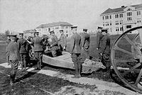 Amid the tumult, the Agricultural College grew modestly, adding its statewide Extension program in 1914.[38] A year later, the first master's degrees were awarded.[39] UAC, as the Utah Agricultural College was commonly abbreviated, also received a notable boost in students as a direct result of World War I.[40] Colleges and universities nationwide were temporarily transformed into training grounds for the short-lived Student Army Training Corps, composed of students who received military instruction and could then return to their educations following their military service.[41] As the then-tiny campus could not otherwise support such large numbers of new students, college president Elmer Peterson convinced the state in 1918 to appropriate funds for permanent brick buildings, which could be used as barracks for SATC students during the war, and instruction afterward.[42] Though the war was soon to end, the campus essentially doubled in size.[43]
