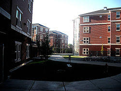 Utah State is the largest public residential campus in the state, and nearly 18,000 students live on or directly adjacent to campus.[74] The university is the center of activity for the entire area, and the campus community is considered very close-knit. 21 widely varying on-campus buildings house single students, and 39 buildings on the north side of campus are available for married housing.[78] Many more students live in the multitude of off-campus housing options nearby. Students on campus may choose to dine in one of two cafeterias, as well as the Quadside Cafe at Merrill-Cazier Library which offers paninis, soups, beverages, and more. There is also a full-service Skyroom restaurant, and the Hub, which includes a number of dining options.[79] On the east edge of campus sits Aggie Ice Cream, a local tourist hotspot dating back to 1888, which produces "world-famous" ice cream and cheese products, as well as sandwiches and soups.[80]