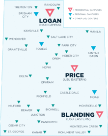 Regional campuses exist in Brigham City, Tooele, and the Uintah Basin (Vernal and Roosevelt). RCDE offers courses at Price and San Juan campuses that constituted the former College of Eastern Utah (now known as Utah State University Eastern). Distance Education operates 21 education centers throughout the state including Moab, Kaysville, Ephraim, Orem, and Salt Lake City.[65] At each of these locations, students may receive a wide selection of degrees without ever stepping foot on the Logan campus. Courses and degrees are also made available online through Distance Education.[66]