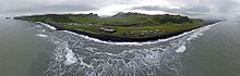 Vík lies directly south of the Mýrdalsjökull glacier, which itself is on top of the Katla volcano. Katla has not erupted since 1918, and this longer than typical dormant period has led to speculation that an eruption may occur soon. An eruption of Katla could melt enough ice to trigger an enormous flash flood, potentially large enough to obliterate the entire town. The town's church, located high on a hill, is believed to be the only building that would survive such a flood.[4] Thus, the people of Vík practice periodic drills and are trained to rush to the church at the first sign of an eruption. The town has 1,400 hotel rooms for scientists and tourists, who are also briefed about Katla's dangers.[5]