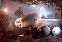 An odometer driven by a vane anemometer on the nose determined when the target area had been reached, accurate enough for area bombing. Before launch, it was set to count backwards from a value that would reach zero upon arrival at the target in the prevailing wind conditions. As the missile flew, the airflow turned the propeller, and every 30 rotations of the propeller counted down one number on the odometer. This odometer triggered the arming of the warhead after about 60 km (37 mi).[29] When the count reached zero, two detonating bolts were fired. Two spoilers on the elevator were released, the linkage between the elevator and servo was jammed, and a guillotine device cut off the control hoses to the rudder servo, setting the rudder in neutral. These actions put the V-1 into a steep dive.[30][31] While this was originally intended to be a power dive, in practice the dive caused the fuel flow to cease, which stopped the engine. The sudden silence after the buzzing alerted listeners of the impending impact.[12][19][32][33]