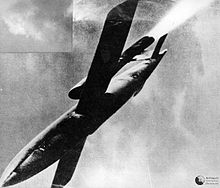 The V-1 flying bomb (German: Vergeltungswaffe 1 "Vengeance Weapon 1"[a])—also known to the Allies as the buzz bomb, or doodlebug,[3][b] and in Germany as Kirschkern (cherry stone)[c] or Maikäfer (maybug),[d] as well as by its official RLM aircraft designation of Fi 103[5]—was an early cruise missile and the only production aircraft to use a pulsejet for power.