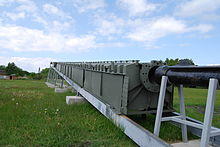 Once near the launch ramp, the wing spar and wings were attached and the missile was slid off the loading trolley, Zubringerwagen, onto the launch ramp. The ramp catapult was powered by the Dampferzeuger trolley. The pulse-jet engine was started by the Anlassgerät, which provided compressed air for the engine intake,and electrical connection to the engine spark plug, and autopilot. The Bosch spark plug was only needed to start the engine, while residual flame ignited further mixtures of gasoline and air, and the engine would be at full power after 7 seconds. The catapult would then accelerate the bomb above its stall speed of 200 mph, and ensuring sufficient ram air.[43][44][45]