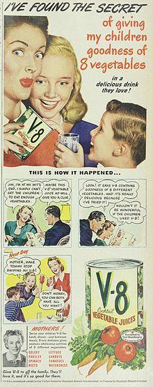 V8 Vegetable Juice, sometimes just called V8, is a trademarked name for a number of beverage products sold worldwide that are made from eight vegetables, or a mixture of vegetables and fruits. Since 1948, the brand has been owned by the Campbell Soup Company.[1]