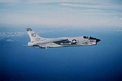 In April 1965, the squadron, now known as the "Lancers", sailed aboard the USS Oriskany, becoming the first Marine jet squadron to be deployed aboard an aircraft carrier in combat. As part of Carrier Air Group 16 (CVW-16) they arrived off the coast of Vietnam and began operating from Yankee Station. From 10 May to 6 December 1965 the Lancers flew missions against targets in North and South Vietnam. During this tour they conducted more than 12,000 combat sorties and delivered nearly 10,000 tons of ordnance. Of note, during a mission on 9 September 1965 they became the first squadron to deliver 2,000-pound MK-84 bombs from an F-8 Crusader that had launched from an aircraft carrier. Also on that day the Commander, Air Group (CAG) of CVW-16 Commander James Stockdale's A-4E Skyhawk was shot down over North Vietnam[13] making the commanding officer of VMF(AW)-212 the acting CAG until a replacement arrived.[14] This made 212's Commanding Officer LtCol Chuck Ludden the first Marine Officer to command a carrier airwing. In December 1965 the squadron returned to Hawaii having flown 3,018 combat hours and 1,588 sorties during their time off the coast of Vietnam.[15]