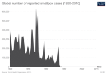 The first disease people tried to prevent by inoculation was most likely smallpox, with the first recorded use of variolation occurring in the 16th century in China.[10] It was also the first disease for which a vaccine was produced.[11][12] Although at least six people had used the same principles years earlier, the smallpox vaccine was invented in 1796 by English physician Edward Jenner. He was the first to publish evidence that it was effective and to provide advice on its production.[13] Louis Pasteur furthered the concept through his work in microbiology. The immunization was called vaccination because it was derived from a virus affecting cows (Latin: vacca 'cow').[11][13] Smallpox was a contagious and deadly disease, causing the deaths of 20–60% of infected adults and over 80% of infected children.[14] When smallpox was finally eradicated in 1979, it had already killed an estimated 300–500 million people in the 20th century.[15][16][17]