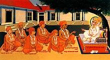The Vachanamrut (IAST: Vacanāmṛta, lit. "immortalising ambrosia in the form of words") is a sacred Hindu text consisting of 273 religious discourses delivered by Swaminarayan from 1819 to 1829 CE and is considered the principal theological text within the Swaminarayan Sampradaya.[1]:6 Compiled by four of his senior disciples, Swaminarayan edited and approved the scripture. As followers believe Swaminarayan to be Parabrahman, or God, the Vachanamrut is considered a direct revelation from God and thus the most precise interpretation of the Upanishads, Bhagavad Gita, and other important Hindu scriptures.[1]:13–14, 45[2]:173 In the Vachanamrut, Swaminarayan outlines the Akshar-Purushottam Darshan and the necessity of the Aksharbrahman Guru to attain moksha, a spiritual state characterised by eternal bliss and devotion to God.[1]:40,47,200–201 This scripture is read by followers regularly and discourses are conducted daily in Swaminarayan temples around the world.[3]:21–27