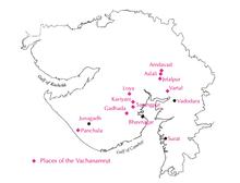 Individual discourses are numbered, chronologically arranged, and categorized based on the location where they were delivered.[5]:12[11]:48 The discourses took place across various towns and villages of Gujarat, India, specifically Gadhada, Sarangpur, Kariyani, Loya, Panchala, Vartal, Amdavad, Ashlali, and Jetalpur.[6]:186 An additional section, accepted by the Ahmedabad diocese, includes discourses from Amdavad, Ashlali, and Jetalpur. While individual discourses were untitled in early manuscripts, with individual Vachanamruts referred to only by their section and number, Gunatitanand Swami and the swamis of the Junagadh mandir created titles for individual discourses to serve as mnemonic tools.[4]:84[2]:188 The BAPS Swaminarayan Sanstha uses these titles in its version of the text, which is an exact printed version of the Vachanamrut text published in 1928 under the auspices of Acharya Shripatiprasad of the Vartal diocese.[1]:13n39