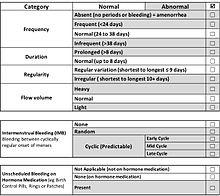 The parameters for normal menstruation have been defined as a result of an international process designed to simplify terminologies and definitions for abnormalities of menstrual bleeding.[6][7] The causes of abnormal vaginal bleeding vary by age.[2]