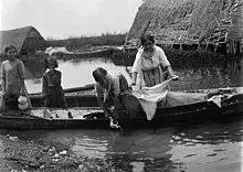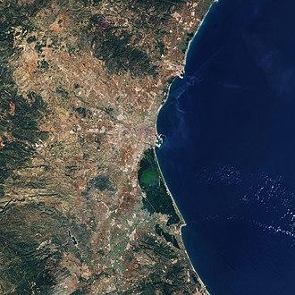The Albufera lagoon, located about 12 km (7 mi) south of the city proper (and part of the municipality), originally was a saltwater lagoon, yet, since the severing of links to the sea, it has eventually become a freshwater lagoon as well as it has progressively decreased in size.[14] The albufera and its environment are exploited for the cultivation of rice in paddy fields, and for hunting and fishing purposes.[14]