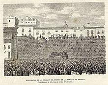Following the introduction of the universal manhood suffrage in the late 19th century, the political landscape in Valencia—until then consisting of the bipartisanship characteristic of the early Restoration period—experienced a change, leading to a growth of republican forces, gathered around the emerging figure of Vicente Blasco Ibáñez.[42] Not unlike the equally republican lerrouxism, the Populist blasquism came to mobilize the Valencian masses by promoting anticlericalism.[43] Meanwhile, in reaction, the right-wing coalesced around several initiatives such as the Catholic League or the re-formulation of the Valencian Carlism and the Valencianism did similarly with organizations such as Valencia Nova or the Unió Valencianista.[44]