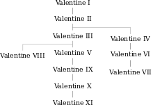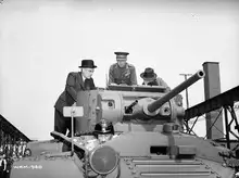 There are several proposed explanations for the name Valentine. According to the most popular one, the design was presented to the War Office on St Valentine's Day, 14 February 1940, although some sources say that the design was submitted on Valentine's Day 1938 or 10 February 1938.[1][3][4] White notes that "incidentally" Valentine was the middle name of Sir John Carden, the man who was responsible for many tank designs including that of the Valentine's predecessors, the A10 and A11.[5][a] Another version says that Valentine is an acronym for Vickers-Armstrong Limited Elswick & (Newcastle-upon) Tyne. The "most prosaic" explanation according to David Fletcher is that it was just an in-house codeword of Vickers with no other significance.[6]