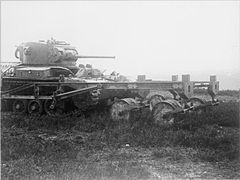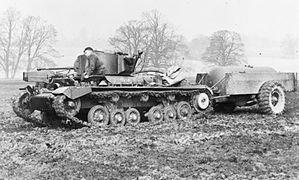 - armoured bridgelaying vehicle; a turretless Mk II fitted with 10 m (34 ft) long by 2.90 m (9 ft 6 in) wide Class 30 (capable of bearing 30 long tons (34 short tons)) scissors bridge. 192 were produced,[30] 25 of them supplied to the USSR.[16] Used in action in Italy, Burma, North-west Europe and Manchuria.