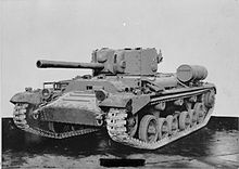 The War Office was initially deterred by the size of the turret, since they considered a turret crew of three necessary, to free the vehicle commander from direct involvement in operating the gun.[10] Concerned by the situation in Europe, it finally approved the design in April 1939 and placed the first order in July for deliveries in May 1940. At the start of the war, Vickers were instructed to give priority to the production of tanks.[11] The vehicle reached trials in May 1940, which coincided with the loss of much of the army's equipment in France, during Operation Dynamo, the evacuation from Dunkirk. The trials were successful and the vehicle was rushed into production as "Tank, Infantry, Mark III"; no pilot models were required as much of the mechanics had been proven on the A10 and it entered service from July 1941.[12]
