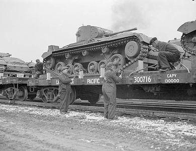 To develop its own tank forces, Canada had established tank production facilities. An order was placed in 1940 with Canadian Pacific and after modifications to the Valentine design to use local standards and materials, the production prototype was finished in 1941.[14] Canadian production was mainly at CPR Angus Shops in Montreal and 1,420 were produced in Canada[15] of 1,388 were sent to the Soviet-Union, with 2,394 exported from Britain.[16] They formed the main Commonwealth export to the Soviet Union under lend-lease. The remaining 32 were retained for training.[16] The use of local GMC Detroit Diesel engines in Canadian production was a success and the engine was adopted for British production. British and Canadian production totalled 8,275, making the Valentine the most produced British tank design of the war.[11]