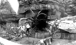 Moving then to Burrinjuck, New South Wales in 1928, Ricetti managed to get some work as a sailor on the Mary Anne, a paddle steamer that worked the Murray River, Murrumbidgee River and Lachlan River. As a part of his travels he followed the Murrumbidgee downstream to the Lachlan then upstream to Hillston, New South Wales. From Hillston he walked, with no fixed destination, along the railway line arriving at the fringes of Griffith where a rainstorm forced him to find shelter. Next day exploring where he had stayed the night he found a huge overhanging rock which formed a dry, cave-like area. Nearby there were two reservoirs full of water, fruit and vegetable farms and a rubbish dump which not only had plenty of rabbits, but where he found a shovel, pick head, and axe head for which he made handles from nearby tree branches.[3]