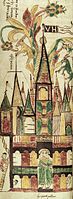Valhalla is first mentioned in chapter 2 of the Prose Edda book Gylfaginning, where it is described partially in euhemerized form. In the chapter, King Gylfi sets out to Asgard in the guise of an old man going by the name of Gangleri to find the source of the power of the gods. The narrative states that the Æsir foresaw his arrival and had prepared grand illusions for him, so that when Gangerli enters the fortress, he sees a hall of such a height that he has trouble seeing over it, and notices that the roof of the hall is covered in golden shields, as if they were shingles. Snorri then quotes a stanza by the skald Þjóðólfr of Hvinir (c. 900). As he continues, Gangleri sees a man in the doorway of the hall juggling short swords, and keeping seven in the air at once. Among other things, the man says that the hall belongs to his king, and adds that he can take Gangleri to the king. Gangleri follows him, and the door closes behind him. All around him he sees many living areas, and throngs of people, some of which are playing games, some are drinking, and others are fighting with weapons. Gangleri sees three thrones, and three figures sitting upon them: High sitting on the lowest throne, Just-As-High sitting on the next highest throne, and Third sitting on the highest. The man guiding Gangleri tells him that High is the king of the hall.[11]