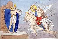 In chapter 20, Third states that Odin mans Valhalla with the Einherjar: the dead who fall in battle and become Odin's adopted sons.[12] In chapter 36, High states that valkyries serve drinks and see to the tables in Valhalla, and Grímnismál stanzas 40 to 41 are then quoted in reference to this. High continues that the valkyries are sent by Odin to every battle, where they choose who is to die, and determine victory.[13]