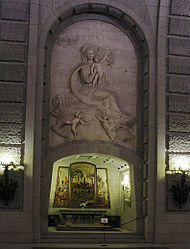 In November 2009, Patrimonio Nacional controversially ordered the closure of the basilica for an indefinite period of time, alleging preservation issues also affecting the Cross and some sculptures.[4] These allegations were contested by experts and the Benedictine Order religious community that lives at the complex, and were seen by some conservative opinion groups as a policy of harassment against the monument.[68] In 2010, the Pietà sculpture group started to be "dismantled" with hammers and heavy machinery, which the Juan de Ávalos trust feared could cause irreparable damage to the sculpture. As a result, thereof, the trust filed several lawsuits against the Spanish government.[69] At the time, several parallels were made by conservative and liberal groups between the dismantling of the Pietà under the PSOE government and the destruction of the Buddhas of Bamyan by the Taliban.[70][71]