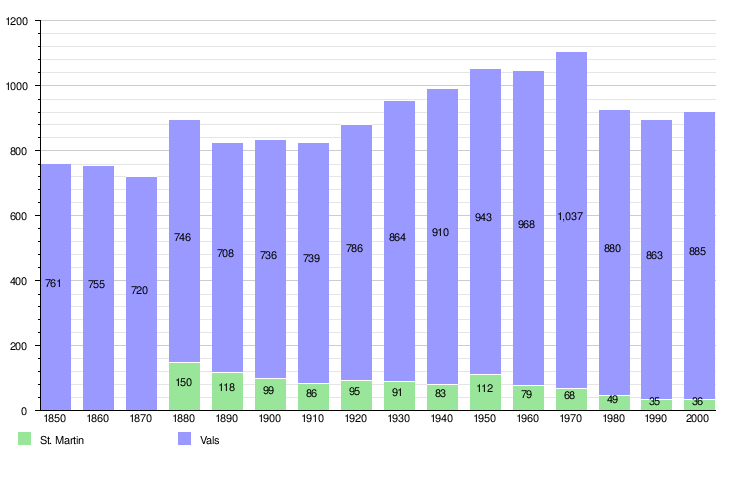 Vals has a population (as of 31 December 2019) of 979.[11] As of 2008, 10.8% of the population was made up of foreign nationals.[12] Over the last 10 years the population has grown at a rate of 1.4%. Most of the population (as of 2000) speaks German (94.4%), with Romansh being second most common ( 2.3%) and Italian being third ( 0.8%).[9]