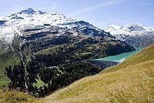 Zervreilasee is a reservoir in the valley, formed by a dam on the Vals Rhine.