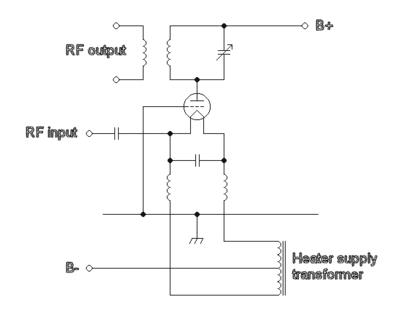 This design uses a triode. The grid current drawn in this system is higher than that required for the other two basic designs. Because of this, valves such as the 4CX250B are not suitable for this circuit. This circuit design has been used at 1296 MHz using disk seal triode valves such as the 2C39A.