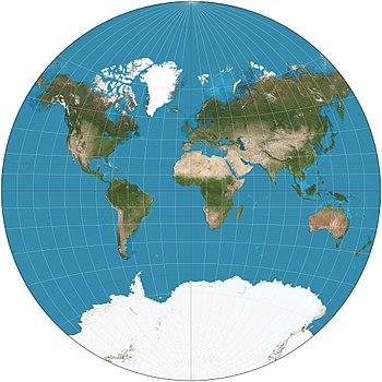 The van der Grinten projection is a compromise map projection, which means that it is neither equal-area nor conformal. Unlike perspective projections, the van der Grinten projection is an arbitrary geometric construction on the plane. Van der Grinten projects the entire Earth into a circle. It largely preserves the familiar shapes of the Mercator projection while modestly reducing Mercator's distortion. Polar regions are subject to extreme distortion.[1]