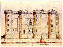 The often-repeated claim that Vanbrugh wrote part of his comedy The Provoked Wife in the Bastille is based on allusions in a couple of much later memoirs and is regarded with some doubt by modern scholars (see McCormick).[18] After being released from the Bastille, he had to spend three months in Paris, free to move around but unable to leave the country, and with every opportunity to see an architecture "unparalleled in England for scale, ostentation, richness, taste and sophistication".[19] He was allowed to return to England in April 1693;[1] once he returned to England he joined the Navy and took part in an unsuccessful naval attack against the French at Brest.[20] At some point in the mid-1690s, it is not known exactly when, he exchanged army life for London and the London stage.[20]