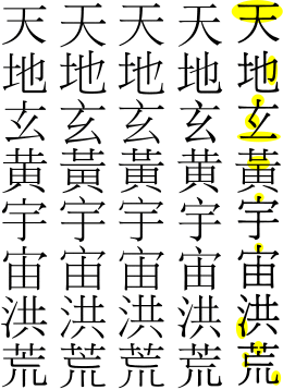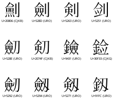 | Different code points, China language tag | Different code points, Taiwan language tag | Different code points, Hong Kong language tag | Different code points, Japanese language tag | Different code points, Korean language tag |