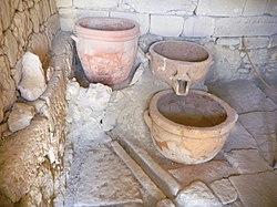 Vathypetro (Greek: Βαθύπετρο) is an archaeological site, four kilometres south of the town of Archanes on Crete (Greece). It contains some of the oldest wine presses in the world. Excavations began in 1949 by the Greek archaeologist Spyridon Marinatos. The estate contains a manor house or villa which had a prominent role in the rural region around Archanes. The complex consists of several buildings, courtyards and workshop spaces. Next to the individual houses is the Minoan wine press (wine press), a plant for the production of olive, a Minoan kiln and ceramics, and the remains of an ancient pottery workshop.