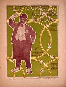 Coupled with their historical presence on the English stage for comic relief,[14] and as operators and actors of the vaudeville stage, Irish Americans became interpreters of immigrant cultural images in American popular culture. New arrivals found their ethnic group status defined within the immigrant population and in their new country as a whole by the Irish on stage.[17] Unfortunately, the same interactions between ethnic groups within the close living conditions of cities also created racial tensions which were reflected in vaudeville. Conflict between Irish and African Americans saw the promotion of black-face minstrelsy on the stage, purposefully used to place African Americans beneath the Irish in the racial and social urban hierarchy.[18]