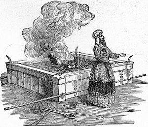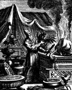 Tractate Zevachim in the Mishnah, Tosefta, and Babylonian Talmud interpreted the law of animal sacrifices in Leviticus 1–5.[41] The Mishnah taught that a sacrifice was slaughtered for the sake of six things: (1) for the sake of the sacrifice for which it was consecrated, (2) for the sake of the offerer, (3) for the sake of the Divine Name, (4) for the sake of the altar fires, (5) for the sake of an aroma, and (6) for the sake of pleasing God, and a sin-offering and a guilt-offering for the sake of sin. Rabbi Jose taught that even if the offerer did not have any of these purposes at heart, the offering was valid, because it was a regulation of the court, since the intention was determined only by the priest who performed the service.[42]