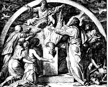 A Tanna recited before Rabbi Isaac bar Abba the words of Leviticus 9:16, “And he presented the burnt offering; and offered it according to the ordinance,” which refer to the obligatory burnt offering that Leviticus 9:2 required Aaron to bring on the eighth day of his consecration. The Tanna reasoned that by saying “according to the ordinance,” Leviticus 9:16 referred to the rules that Leviticus 1:3–9 applied to voluntary burnt offerings, and thus taught that those rules also applied to obligatory burnt offerings. The Tanna concluded that as Leviticus 1:4 required laying on of hands for voluntary burnt offerings, the law also required laying on of hands for obligatory burnt offerings.[61]