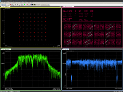 Typical vector signal analyzer displays feature the spectrum of the signal measured within the IF bandwidth, a constellation diagram of the demodulated signal, error vector magnitude measurements, and a time-domain plot of the signal. Many more measurement results can be displayed depending on the type of modulation being used (symbol decoding, MIMO measurements, radio frame summary, etc.).