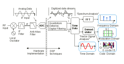 Vector signal analyzers are useful in measuring and demodulating digitally modulated signals like W-CDMA, LTE, and WLAN.[1] These measurements are used to determine the quality of modulation and can be used for design validation and compliance testing of electronic devices.