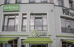 The global mock-meats market increased by eighteen percent between 2005 and 2010,[75] and in the United States by eight percent between 2012 and 2015, to $553 million a year.[76] De Vegetarische Slager, the first known vegetarian butcher shop, selling mock meats, opened in the Netherlands in 2010,[75][77] while America's first vegan butcher, the Herbivorous Butcher, opened in Minneapolis in 2016.[76][78] By 2016, forty-nine percent of Americans were drinking plant milk, although 91 percent still drank dairy milk.[79] In the United Kingdom the plant milk market increased by 155 percent in two years, from 36 million litres in 2011 to 92 million in 2013.[80] In 2011 Europe's first vegan supermarkets appeared in Germany: Vegilicious in Dortmund and Veganz in Berlin.[81][82]