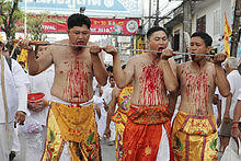 The festivities in Phuket include a procession of masong wearing elaborate costumes who pierce their cheeks and tongues with all manner of things, including swords, banners, machine guns, table lamps, and flowers. While the face is the most common area pierced, some also pierce their arms with pins and fishhooks. Teams of people accompany the masong to keep their wounds clean and to help support the heavier piercings. It is believed that while they are possessed the masong will not feel any pain. They can also be seen shaking their heads back and forth continually, and usually do not seem to "see" their surroundings. At the temple during the festival there is also firewalking and blade-ladder climbing. While large crowds of people gather to watch, the entranced mah song distribute blessed candy and pieces of orange cloth with Chinese characters printed on them yan ยันต์ for good luck.