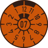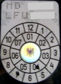After a vehicle has passed the inspection, a safety inspection decal is placed on the rear license plate. The emission inspection decal was placed on the front license plate until it was phased out in 2010 and integrated into the safety inspection. The decal is placed with the number of the expiration month pointing to the top, and the colour of the decal changes every year in a six-year cycle (orange, blue, yellow, brown, pink, green). That way, the date of expiry can be checked at a glance and from far away, hence the black mark around the 12.