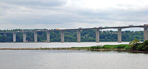 Highway E45 passes close to downtown Vejle on the Vejle Fjord Bridge. Vejle is also located on Primary Route 28, and the Mid-Jutland Highway (Midjyske Motorvej, Primary Route 18) from Herning.[8]