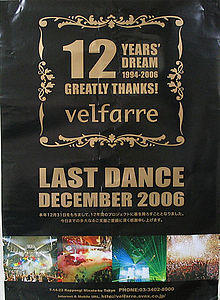 Velfarre (ヴェルファーレ, Verufāre) was a disco located in the Roppongi district of Tokyo, Japan. Velfarre was the self-professed "largest disco in Asia" with a capacity of 1,500 people, with three floors above ground and three floors below; owned by Tetsuya Komuro and Avex Trax. Velfarre was known for Trance, Eurobeat, Techno, Para Para, and Disco related events. Velfarre held concerts for Avex Trax artists, and was able to be rented for private events.[1]