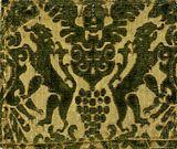 VELVET, a silken textile fabric having a short dense piled surface. In all probability the art of velvet-weaving originated in the Far East; and it is not till about the beginning of the 14th century that we find any mention of the textile. The peculiar properties of velvet, the splendid yet softened depth of dye-colour it exhibited, at once marked it out as a fit material for ecclesiastical vestments, royal and state robes, and sumptuous hangings; and the most magnificent textures of medieval times were Italian velvets. These were in many ways most effectively treated for ornamentation, such as by varying the colour of the pile, by producing pile of different lengths (pile upon pile, or double pile), and by brocading with plain silk, with uncut pile or with a ground of gold tissue, &c. The earliest sources of European artistic velvets were Catanzaro,[3][4] Lucca, Genoa, Florence, and Venice, which continued to send out rich velvet textures. Somewhat later the art was taken up by Flemish weavers, and in the sixteenth century, Bruges attained a reputation for velvets that were not inferior to those of the great Italian cities.[5]