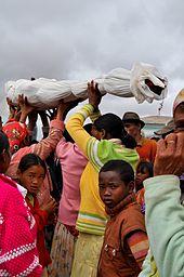 Veneration of ancestors is prevalent throughout the island of Madagascar. Approximately half of the country's population of 20 million currently practice traditional religion,[12] which tends to emphasize links between the living and the razana (ancestors). The veneration of ancestors has led to the widespread tradition of tomb building, as well as the highlands practice of the famadihana, whereby a deceased family member's remains may be exhumed to be periodically re-wrapped in fresh silk shrouds before being replaced in the tomb. The famadihana is an occasion to celebrate the beloved ancestor's memory, reunite with family and community, and enjoy a festive atmosphere. Residents of surrounding villages are often invited to attend the party, where food and rum are typically served and a hiragasy troupe or other musical entertainment is commonly present.[13] Veneration of ancestors is also demonstrated through adherence to fady, taboos that are respected during and after the lifetime of the person who establishes them. It is widely believed that by showing respect for ancestors in these ways, they may intervene on behalf of the living. Conversely, misfortunes are often attributed to ancestors whose memory or wishes have been neglected. The sacrifice of zebu is a traditional method used to appease or honor the ancestors. Small, everyday gestures of respect include throwing the first capful of a newly opened bottle of rum into the northeast corner of the room to give the ancestors their due share.[14]