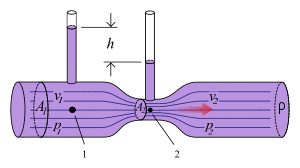 where is the density of the fluid, is the (slower) fluid velocity where the pipe is wider, is the (faster) fluid velocity where the pipe is narrower (as seen in the figure).