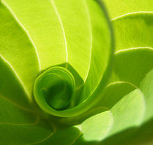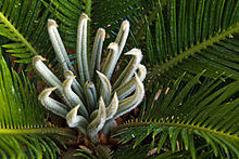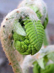 Circinate vernation is the manner in which a fern frond emerges. As the fern frond is formed, it is tightly curled so that the tender growing tip of the frond (and each subdivision of the frond) is protected within a coil. At this stage it is called a crozier (after the shepherd's crook) or fiddlehead (after the scrollwork at the top of a violin). As the lower parts of the frond expand and toughen up, they begin to photosynthesize, supporting the further growth and expansion of the frond. By photosynthesizing, the frond increases the amount of solute inside the frond, which lowers the internal water gradient and facilitates an increase in volume that forces uncoiling. In the case of many fronds, long hairs or scales provide additional protection to the growing tips before they are fully uncoiled. Circinate vernation may also be observed in the extension of leaflets, in the compound leaves of cycads.[1] Circinate vernation is also typical of the carnivorous plant family Droseraceae,[2] for example see this photo of Drosera filiformis. It is also seen in the related genera Drosophyllum and Triphyophyllum, and in the much more distantly related Byblis; however in these three genera, the leaves are coiled outwards towards the abaxial surface of the leaf (reverse circinate vernation): this appears to be unique to these three plants among the angiosperms.[3]